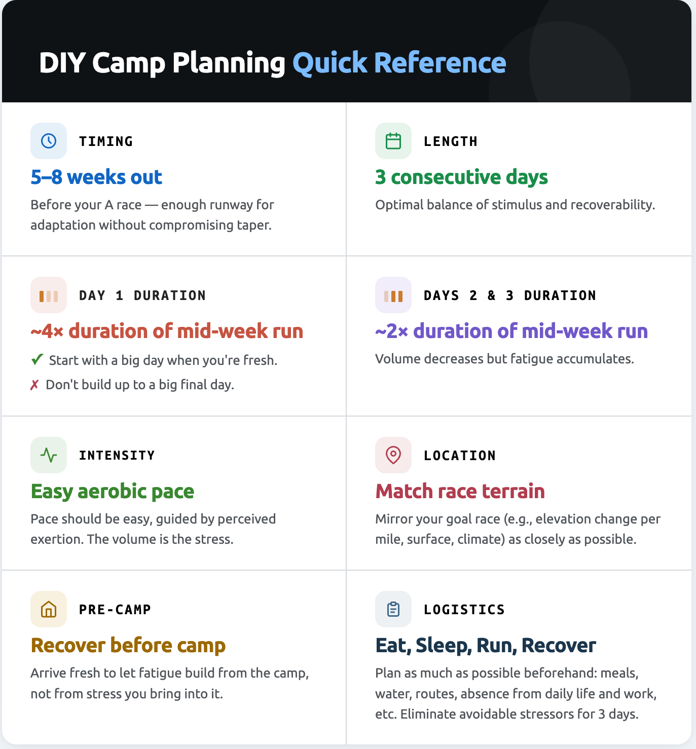- Too far out: Specificity fades and you risk peaking too early. You’ll be fit, but you’ll lose the rehearsal benefit that makes a camp valuable.