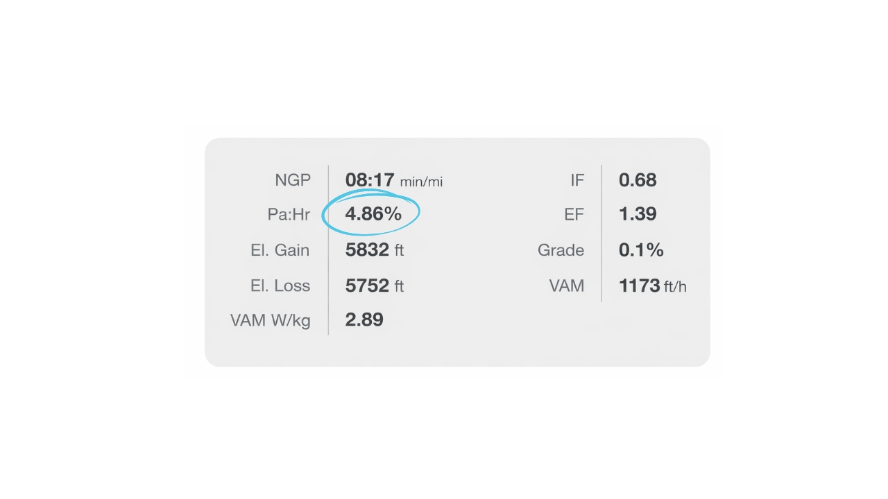 Aerobic decoupling (Pa:Hr) is presented as a percentage. The more your heart rate climbs relative to your pace, the higher the percentage and the greater the decoupling. Generally, less decoupling means you have the aerobic conditioning to sustain that pace.
