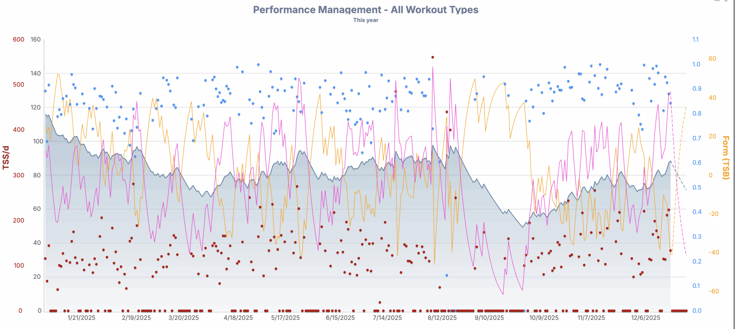 The massive drop in CTL from mid-August to the end of September was a much-needed break from training after about two years of consistent work. Notice, the yellow line (TSB or “form”) went way up while Acute Training Load (ATL, pink line) declined sharply. That period indicates significant recovery and rest, after which I’ve rebuilt fitness gradually from October through December.