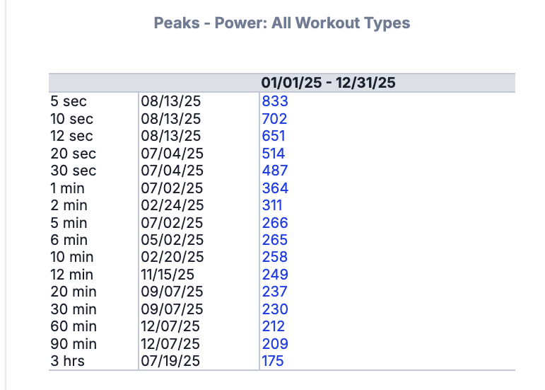 Using my data and experiences as an example, I can tell you that in 2025 I had my best days on the bike when my CTL was between 85 and 95. During 2025 I felt worst in March because repeated illnesses, travel, and inconsistent training led my CTL to drop to 69. I built back up to the 80s and 90s by August, which enabled me to create wonderful memories from great days at the Leadville 100 and on big climbs in Italy (where I never even looked at training data). Then, following a 6-week period of deep recovery in late summer, I built back to a CTL in the 80s in late November into December and then set several long-segment peak power durations (12-90 minutes) for the year.