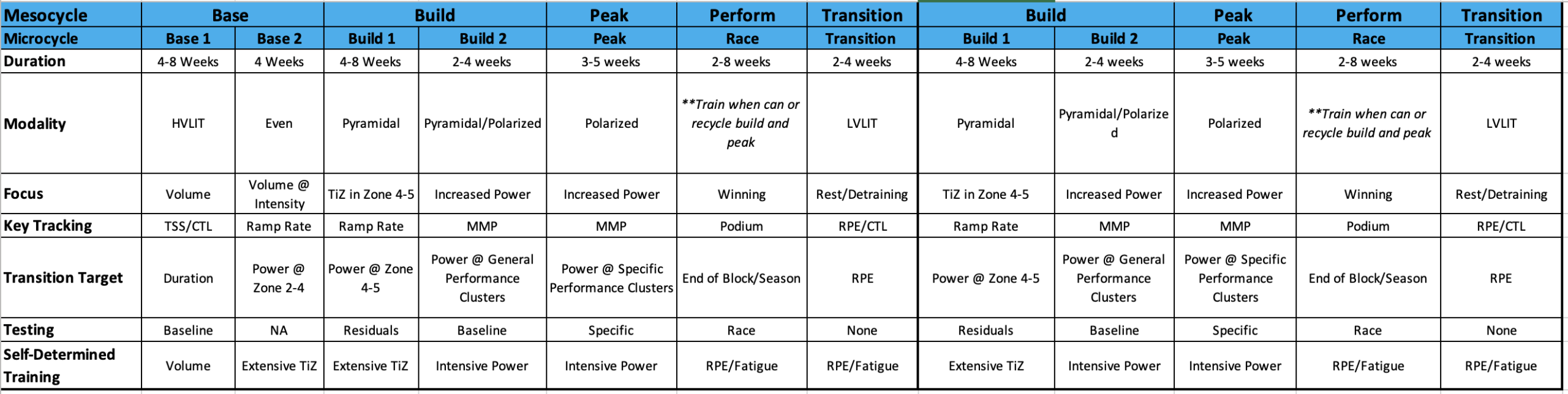 Long Tempo and Low Threshold workouts belong in your Build/Preparation phases rather than your Base/Foundation or Race/Specificity phases. For athletes peaking for summertime events, this typically means Long Tempo and Low Threshold workouts fall in late winter into spring. And if you’re preparing for two race seasons or two peaks during the year you may return to these workouts again.