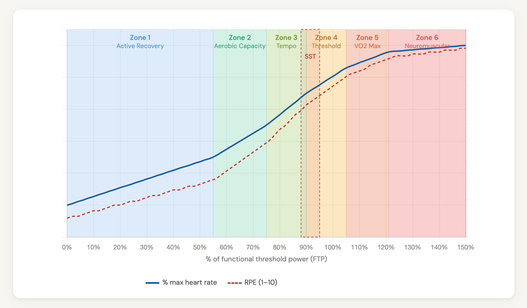 Long Tempo intervals are straightforward. You ride a steady Zone 3 effort (80-90% of FTP) at a deliberately low cadence of 70–80 rpm. These will feel moderate and sustainable at the beginning (rating of perceived exertion of 6 out of 10) and feel moderately uncomfortable (RPE of 7/10) by the end. Most athletes should aim for 45-60 minutes of total time-in-zone for a session. Advanced athletes can increase this to 90-120 minutes.