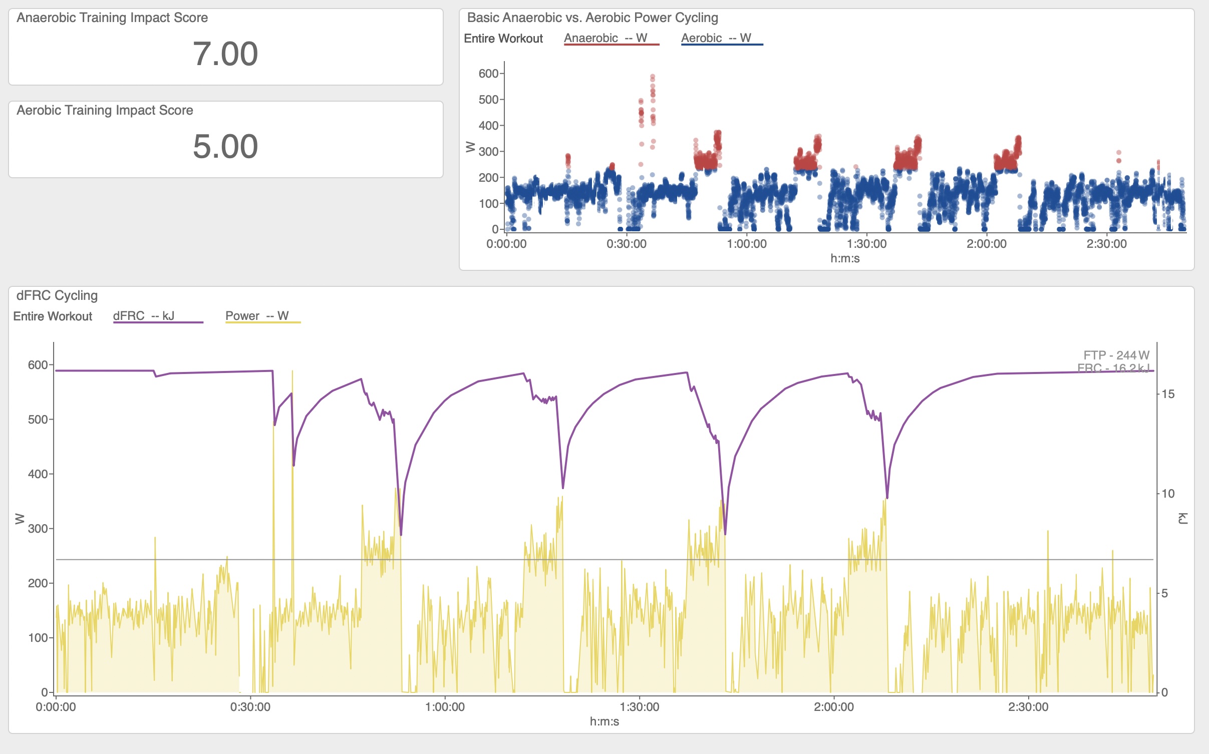 The workout in the second image (below) features longer, complete recovery periods. You can see that between hard efforts, the dFRC line returns to baseline, meaning the athlete is almost entirely aerobic. From this state, it is difficult for each individual effort to fully drain the anaerobic battery. This workout can be effective and useful, but it is not targeted at developing Functional Reserve Capacity.