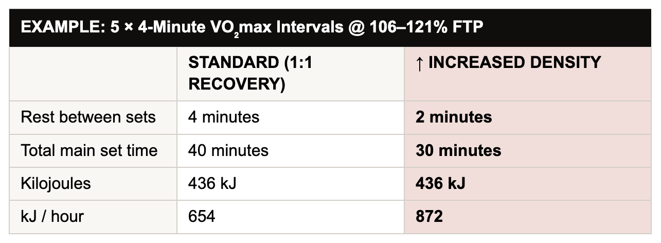 The chart below shows how shortening the recovery time in a 5 x 4-minute VO₂ max interval workout increases training density from 654 kJ/hr to 872 kJ/hr.